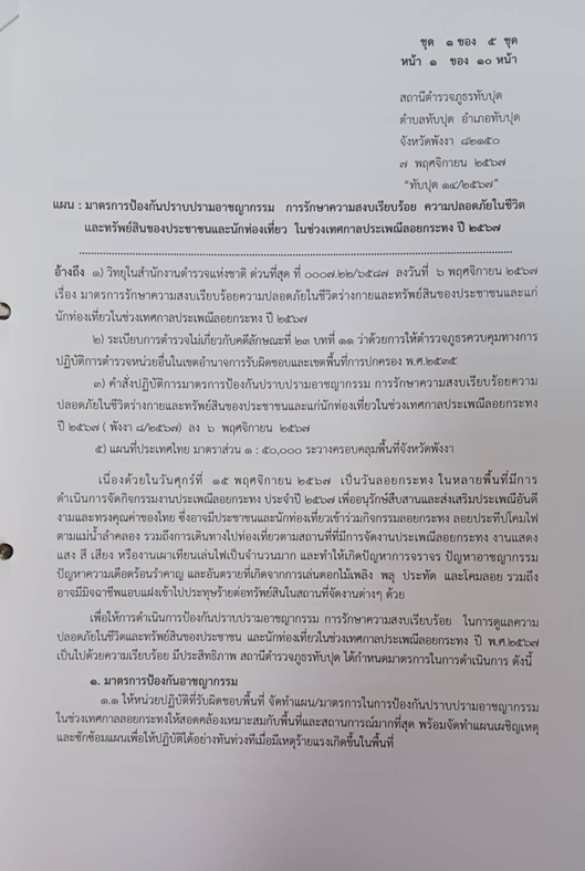 ออกแผนมาตรการป้องกันปราบปรามอาชญากรรม การรักษาความสงบเรียบร้อยความปลอดภัยในชีวิตและทรัพย์สินของประชาชนและนักท่องเที่ยว ในช่วงเทศกาลประเพณีลอยกระทง ปี 2567 ที่ ทับปุด 14/2567 ลง 7 พ.ย.67