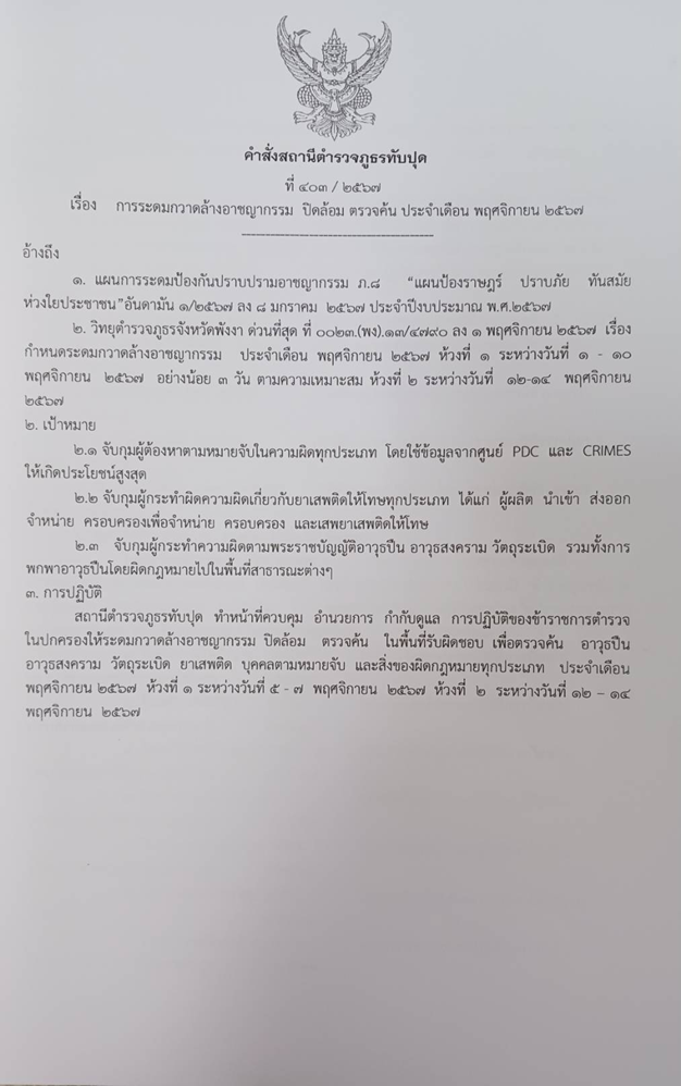 ออกคำสั่งการระดมกวาดล้างอาชญากรรม ประจำเดือน พฤศจิกายน 2567 ที่ 403/2567 ลง 4 พ.ย.67 ห้วงที่ 1 ระหว่างวันที่ 5-7 พ.ย.67 ห้วงที่ 2 ระหว่างวันที่ 12-14 พ.ย.67
