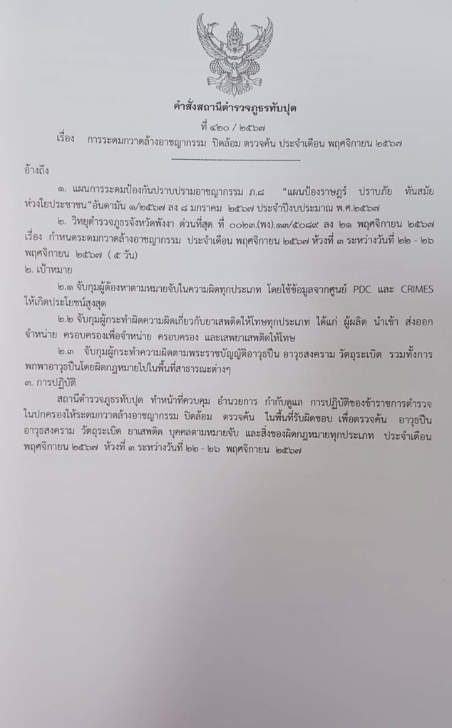 ออกคำสั่งการระดมกวาดล้างอาชญากรรม ประจำเดือน พฤศจิกายน 2567 ที่ 420/2567 ลง 21 พ.ย.67 ห้วงที่ 3 ระหว่างวันที่ 22-26 พ.ย.67