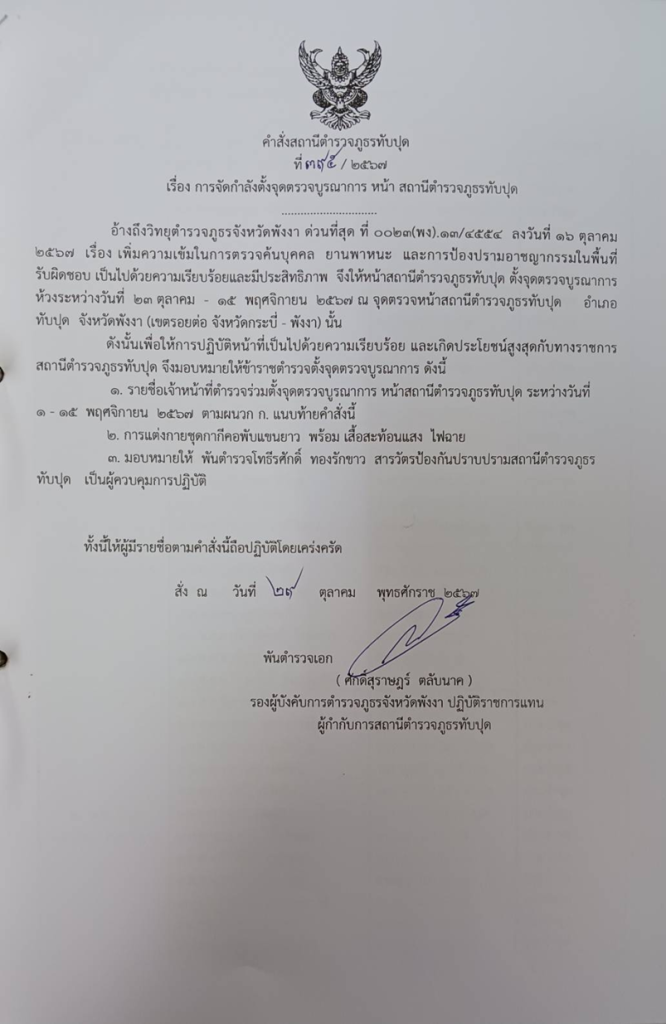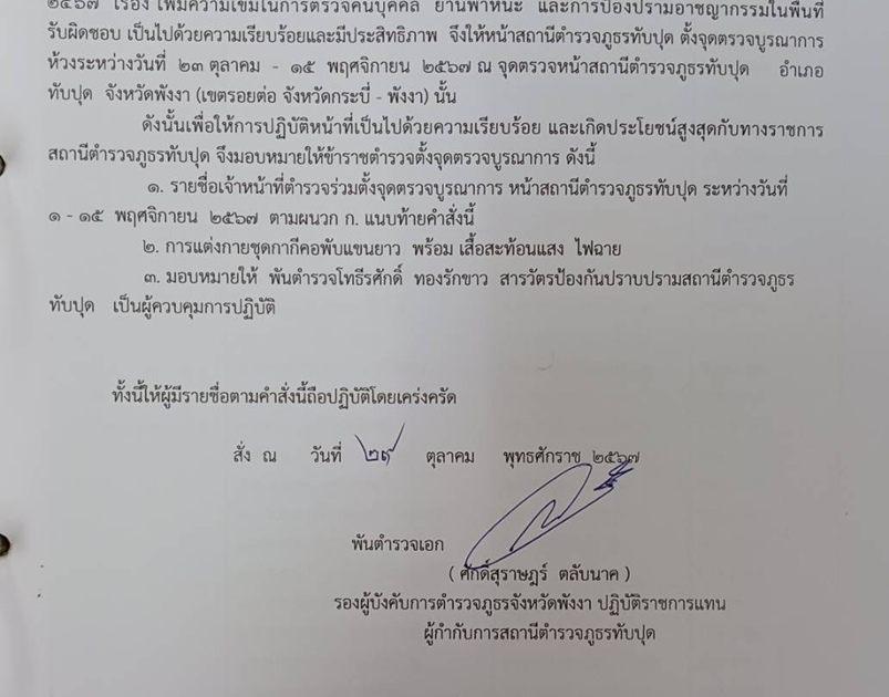 ออกคำสั่ง การจัดกำลังตั้งจุดตรวจบูรณาการ หน้า สภ.ทับปุด ที่ 395/2567 ระหว่างวันที่ 1-15 พ.ย.67 ลง 29 พ.ย.67