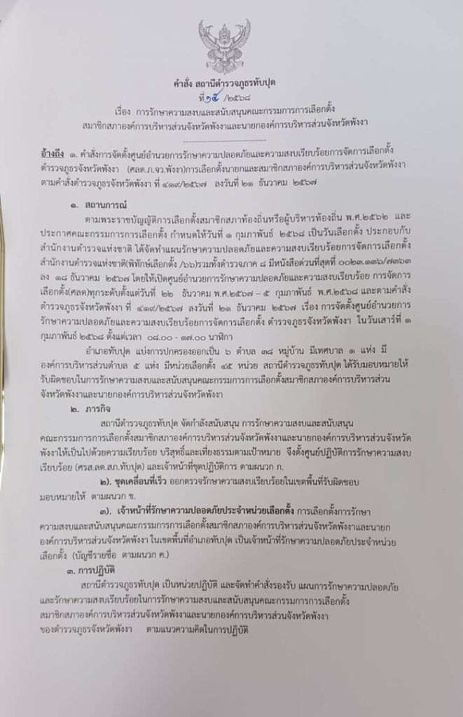 ออกคำสั่งการรักษาความสงบและสนับสนุนคณะกรรมการการเลือกตั้งสมาชิกองค์การบริหารส่วนจังหวัดพังงาและนายกองค์การบริหารส่วนจังหวัดพังงา ที่15/2568 ลง 15 ม.ค.68