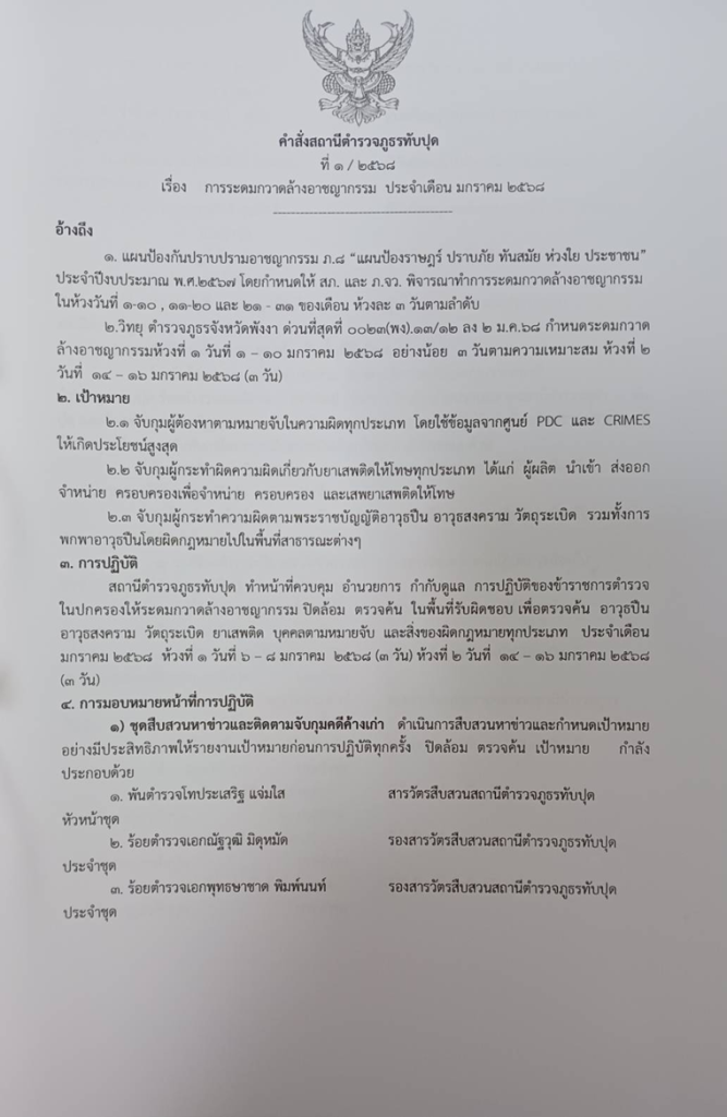 ออกคำสั่งการระดมกวาดล้างอาชญากรรม ประจำเดือน มกราคม 2568 ที่ 1/2568 ลง 3 ม.ค.68 ห้วงที่ 1 ระหว่างวันที่ 6-8 ม.ค.68 ห้วงที่ 2ระหว่างวันที่ 14-16 ม.ค.68