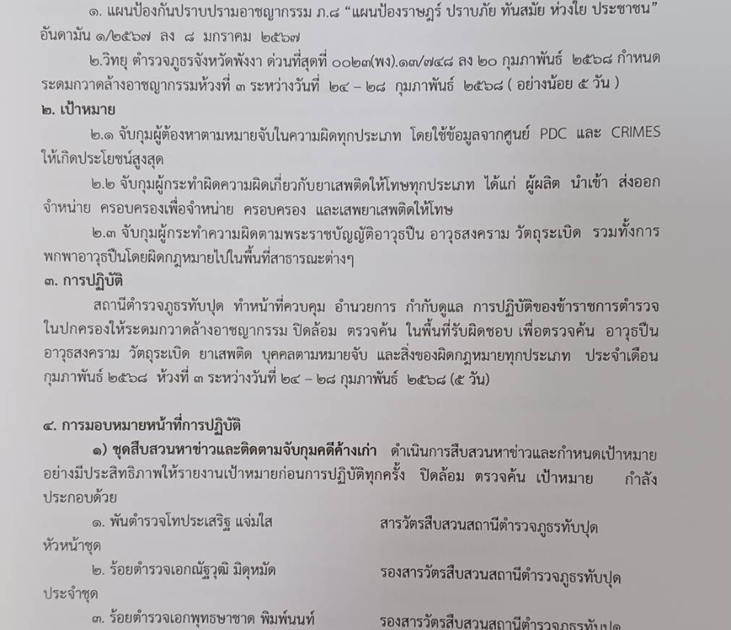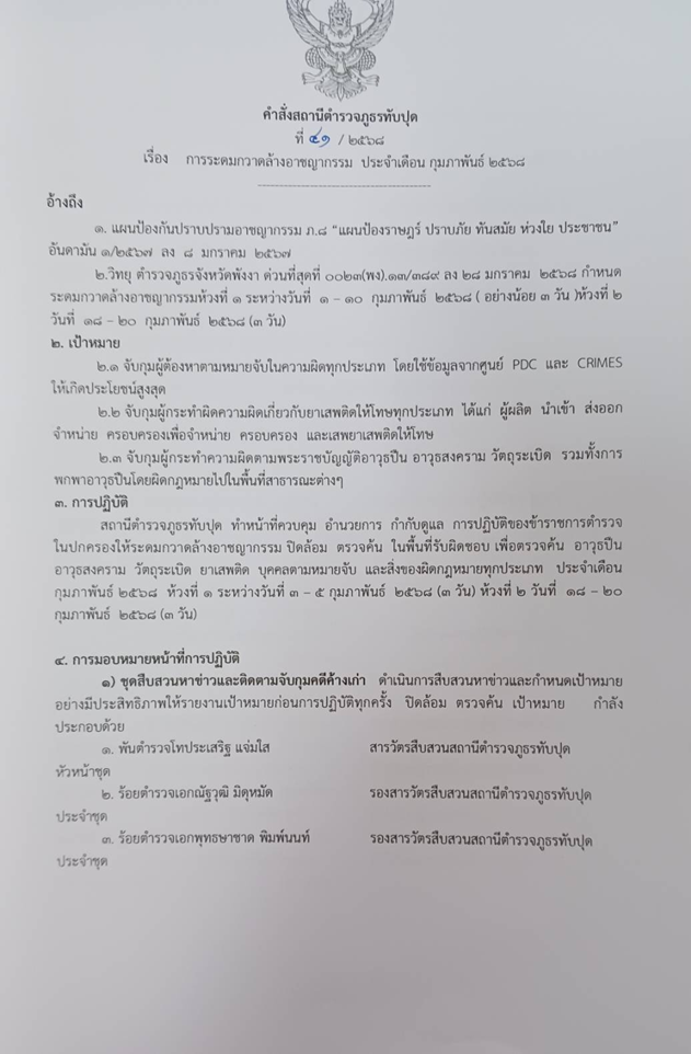 ออกคำสั่งการระดมกวาดล้างอาชญากรรมประจำเดือน กุมภาพันธ์ 2568 ที่ 41/2568 ลง 30 ม.ค.68 ห้วงที่ 1 ระหว่างวันที่ 3-5 ก.พ.68 ห้วงที่ 2 ระหว่างวันที่ 18-20 ก.พ.68