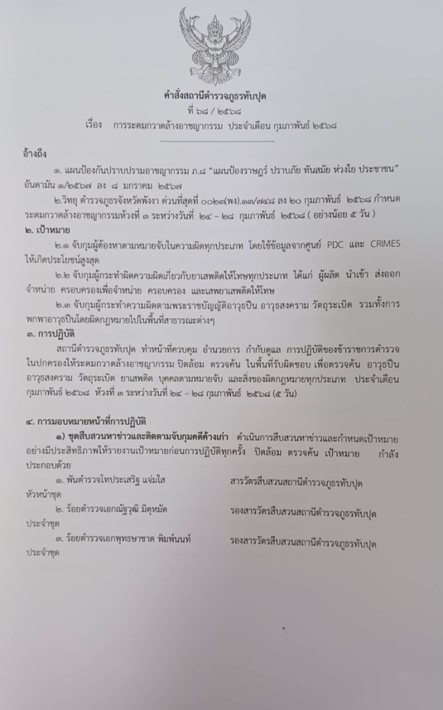 ออกคำสั่งการระดมกวาดล้างอาชญากรรมประจำเดือน กุมภาพันธ์ 2568 ที่ 68/2568 ลง 20 ก.พ.68 ห้วงที่ 3 ระหว่างวันที่ 24-28 ก.พ.68