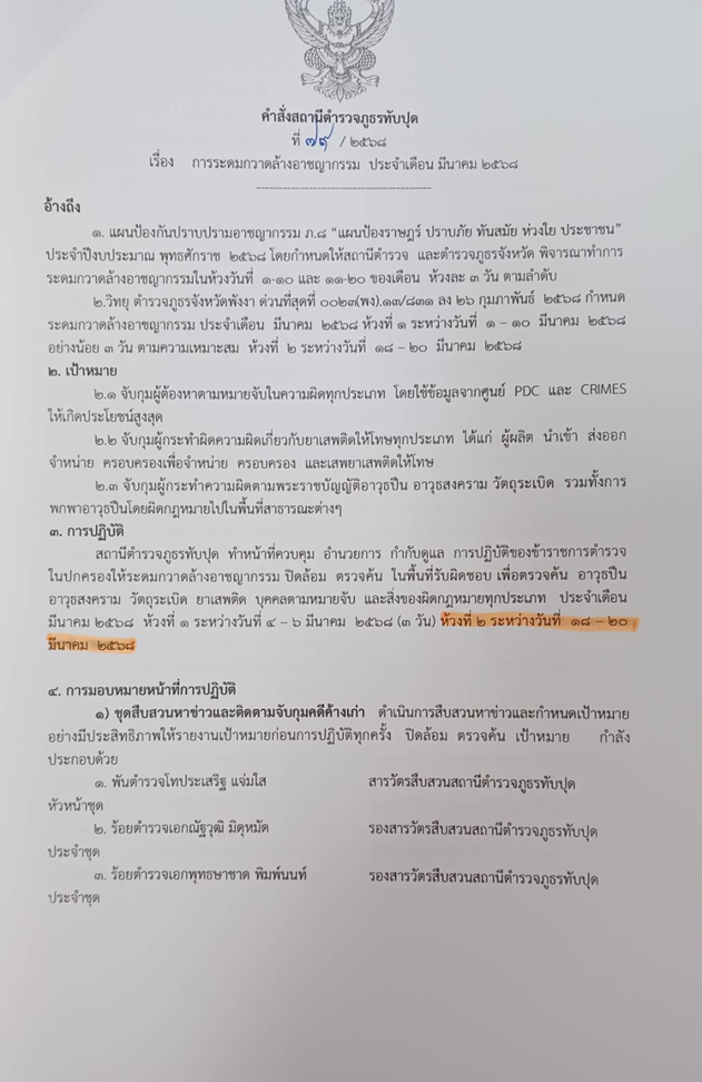 ออกคำสั่งการระดมกวาดล้างอาชญากรรมประจำเดือน มีนาคม 2568 ที่ 128/2568 ลง 18 มี.ค.68 ห้วงที่ 2 ระหว่างวันที่ 18-20 มี.ค.68