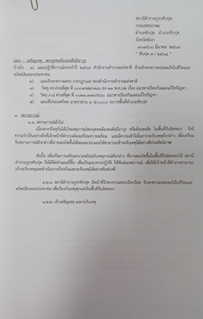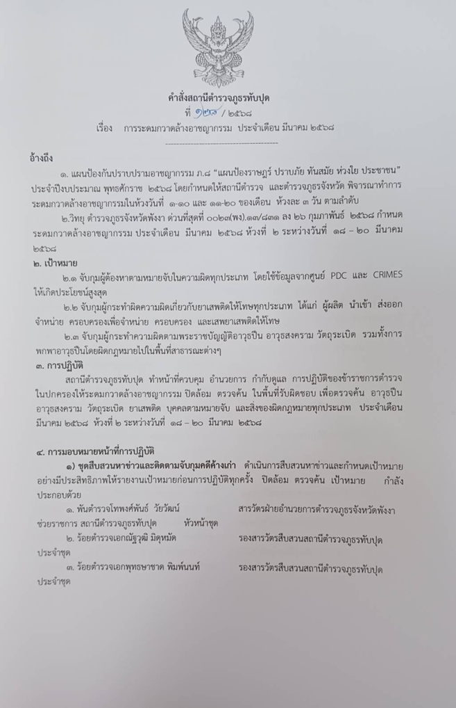 - แผนพบบุคคลต้องสงสัยมีอาวุธ ที่ ทับปุด 7/2568 ลง 11 มี.ค.68