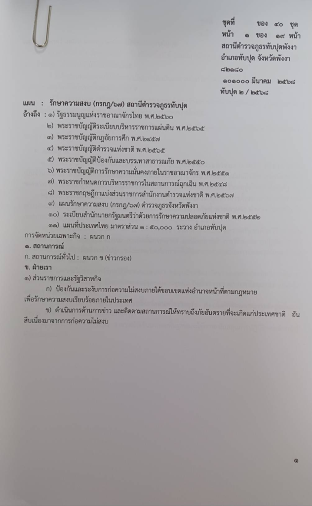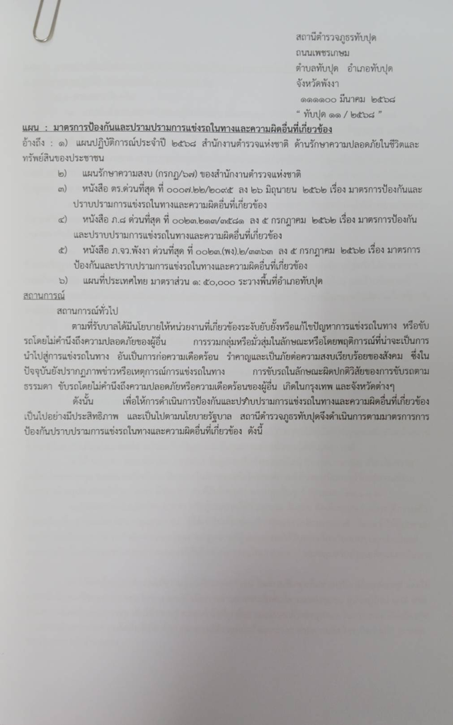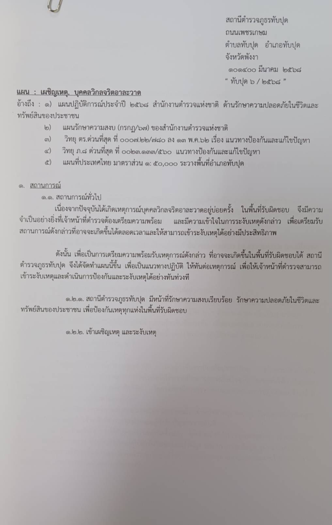 - แผนรักษาความปลอดภัยนักท่องเที่ยว ที่ ทับปุด 14/2568 ลง 11 มี.ค.68