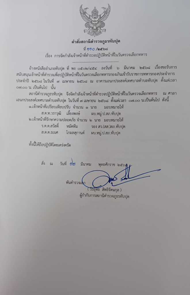 ออกคำสั่งการจัดกำลังเจ้าหน้าที่ตำรวจปฏิบัติหน้าที่ในวันตรวจเลือกทหาร ที่ 110/2568 ลง 12 มี.ค.68