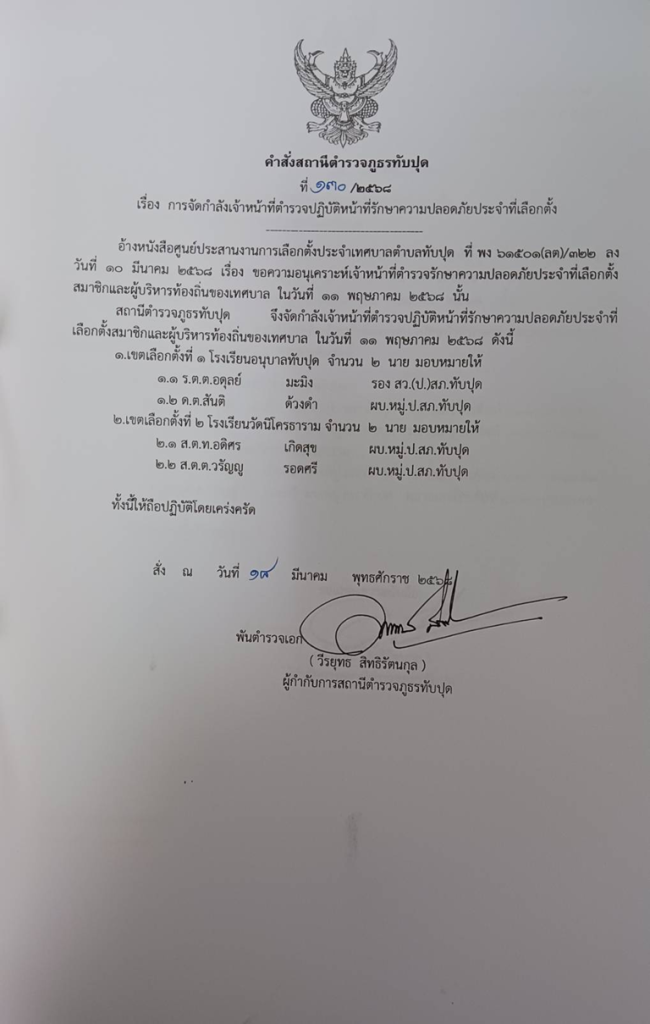 ออกคำสั่งการจัดกำลังเจ้าหน้าที่ตำรวจปฏิบัติหน้าที่รักษาความปลอดภัยประจำที่เลือกตั้ง ที่ 130/2568 ลง 18 มี.ค.68
