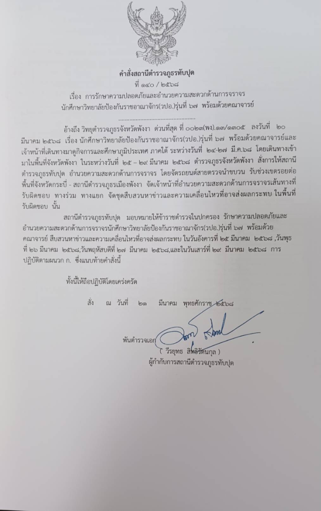 ออกคำสั่งการรักษาความปลอดภัยและอำนวยความสะดวกด้านการจราจรนักษาศึกษาวิทยาลัยป้องกันราชอาณาจักร (วปอ.)รุ่นที่ 67 ที่ 140/2568 ลง 21 มี.ค.68