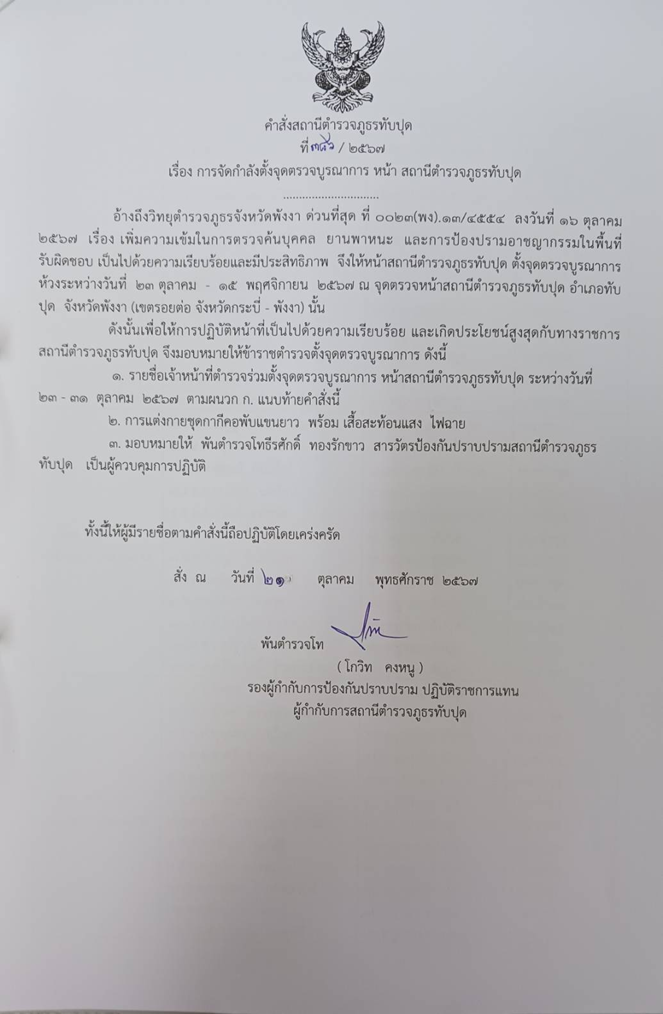 4.ออกคำสั่งการจัดกำลังตั้งจุดตรวจบูรณาการหน้า สภ.ทับปุดระหว่างวันที่ 21 -31 ต.ค.67