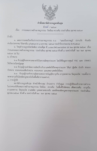 2.ออกคำสั่งการระดมกวาดล้างอาชญากรรมประจำเดือน ตุลาคม 2567 ที่ 388/2567 ลง วันที่ 22 ตุลาคม 2567 ครั้งที่ 3 ระหว่างวันที่ 23-27 ต.ค.67