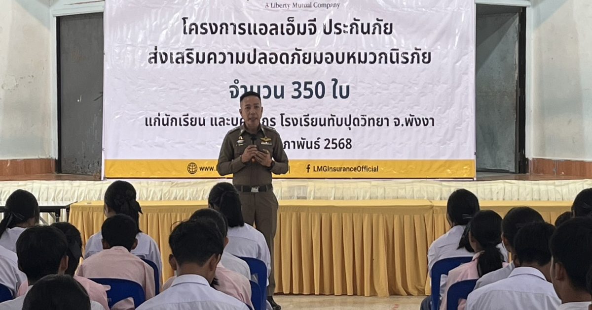 รอง ผกก.ป.สภ.ทับปุด ข่ายจราจร อบรมให้ความรู้เรื่องกฎหมายจราจรและอุบัติเหตุบนท้องถนนตามโครงการ”แอลเอ็มจี ประกันภัยส่งเสริมความปลอดภัยมอบหมวกนิรภัย”และร่วมมอบหมวกนิรภัยให้แก่นักเรียนโรงเรียนทับปุดวิทยา