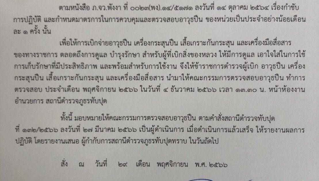 แจ้งข้าราชการตำรวจที่เบิกอาวุธปืนของทางราชการ ให้นำมาตรวจหน้าห้องงานอำนวยการ ชั้น 2 สภ.ทับปุด ในวันจันทร์ ที่ 4 ธันวาคม 2566 เวลา 13.30 น.