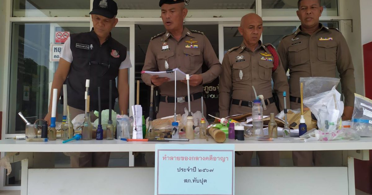 ตามคำสั่งสถานีตำรวจภูธรทับปุดที่ 115/2567 ลง 25 มีนาคม 2567 เรื่องแต่งตั้งคณะกรรมการทำลายประเภทของกลางที่ศาลมีคำพิพากษาริบของกลาง โดย พ.ต.อ.สมบัติ แสวงสุข ผกก.สภ.ทับปุด ประธานกรรมการ พร้อมกรรมการตามคำสั่งดังกล่าว ได้รวบรวมประเภทของกลางคดีอาญาที่ศาลพิพากษาให้ริบ เพื่อดำเนินการทำลายระเบียบสำนักงานตำรวจแห่งชาติ ว่าด้วยการเก็บรักษาและการจำหน่ายของกลาง พ.ศ.2565 ข้อที่ 50 ได้ดำเนินการเผาทำลายตามระเบียบแล้ว