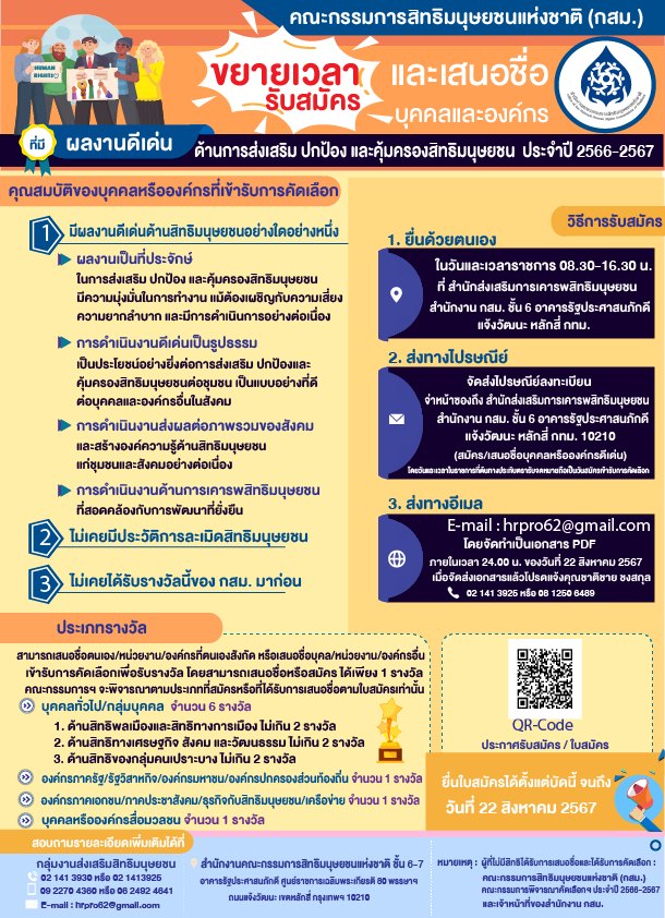 กสม. ขยายเวลารับสมัครและเสนอชื่อบุคคลและองค์กรที่มีผลงานดีเด่นด้านการส่งเสริม ปกป้อง และคุ้มครองสิทธิมนุษยชน ประจำปี 2566 – 2567 จนถึงวันที่ 22 สิงหาคม 2567