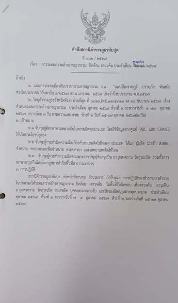 1.ออกคำสั่งการระดมกวาดล้างอาชญากรรมประจำเดือน ตุลาคม 2567 ที่ 362/2567 ลง วันที่ 1 ตุลาคม 2567ครั้ง