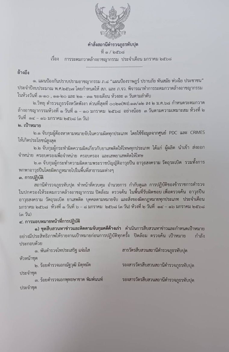 ออกคำสั่ง การระดมกวาดล้างอาชญากรรมประจำเดือน ธันวาคม 2567 ที่ 433/2567 ลง 2 ธ.ค.67 ห้วงที่ 1 ระหว่