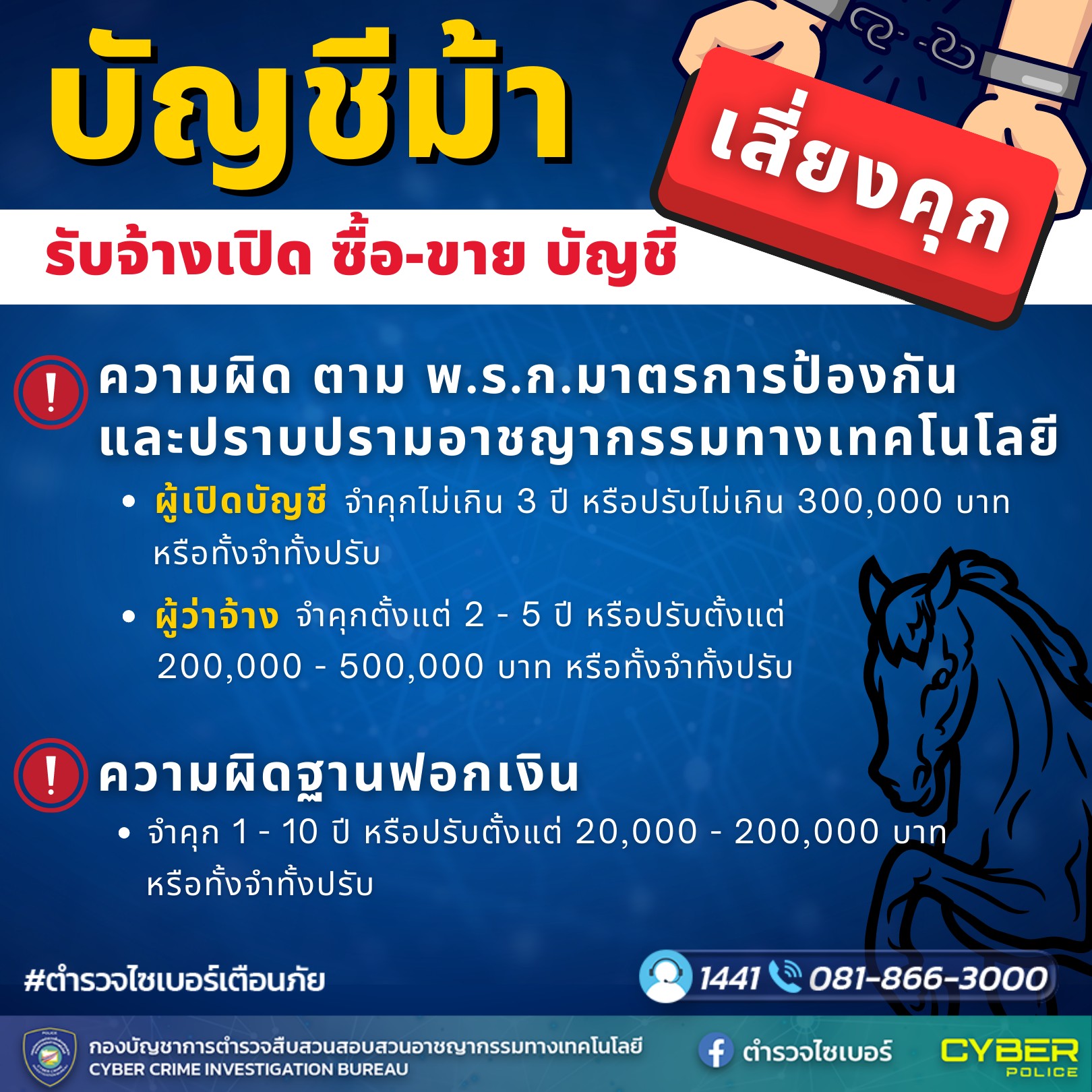 ตำรวจไซเบอร์เตือนภัย รับจ้างเปิดบัญชี มีโทษทางกฎหมาย เสี่ยงคุก!! บัญชีม้า หนึ่งในวิธีการของมิจฉาชีพ
