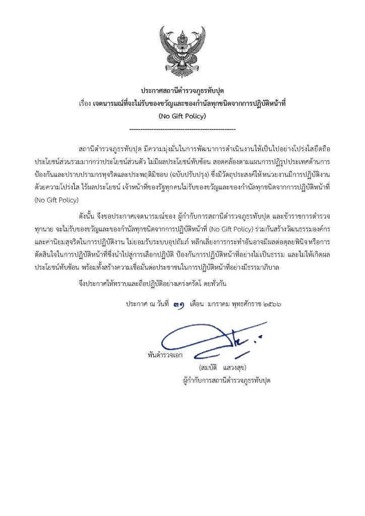 เรื่อง เจตนารมณ์ที่จะไม่รับของขวัญและของกำนัลทุกชนิดจากการปฏิบัติหน้าที่ (No Gift Policy)